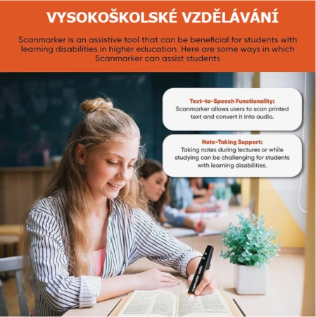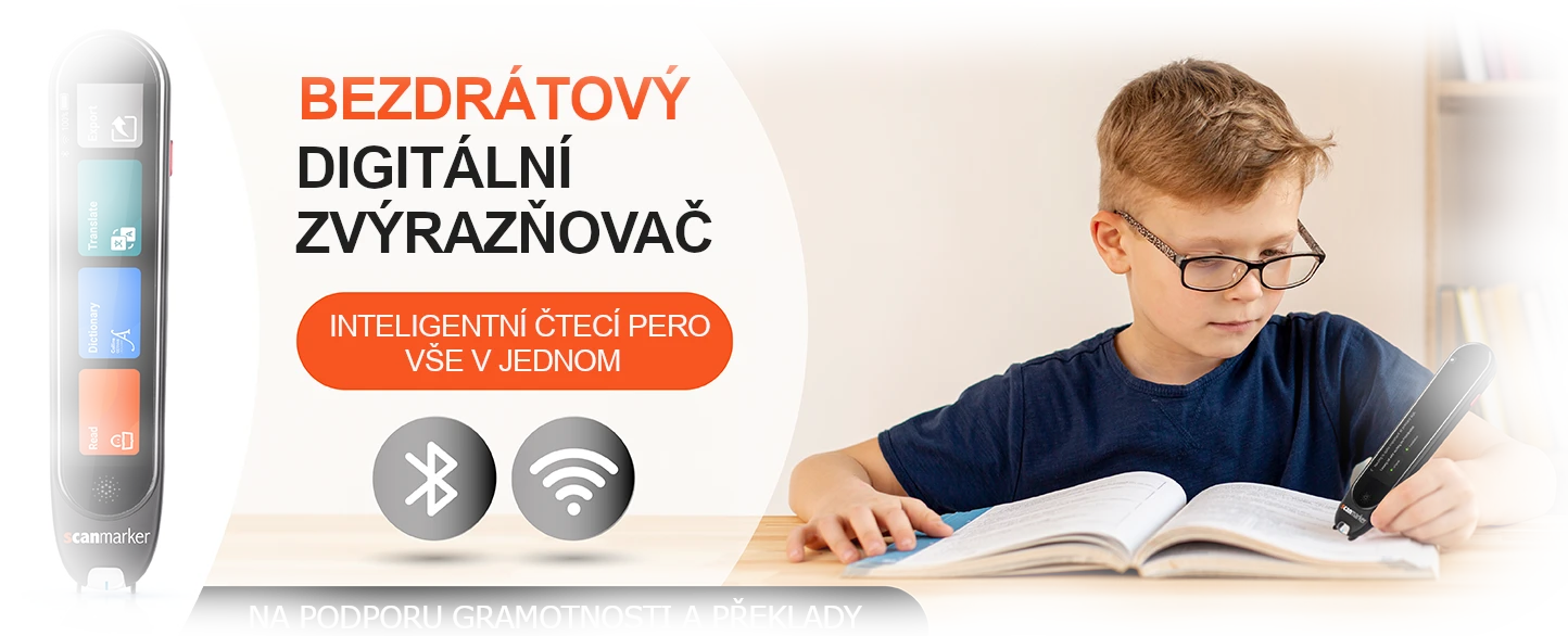 Scanmarker Reader je bezdrátové čtecí pero, které poskytuje vysoce kvalitní převod textu na řeč během skenování. Společně s webovou aplikací Scanmarker Reader a jejími integrovanými výukovými nástroji nabízí dokonalou podporu čtení a pomáhá rozvíjet dovednosti pro samostatné čtení. Toto efektivní čtecí zařízení je navrženo s ohledem na osoby s dyslexií a dalšími obtížemi ve čtení, s cílem pomoci každému uživateli stát se samostatným čtenářem.