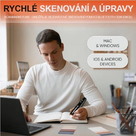 Skener Scanmarker Air je praktický a snadno ovladatelný nástroj, který usnadňuje každodenní práci v kanceláři, škole nebo domácnosti. Díky svým kompaktním rozměrům se snadno vejde do každého pracovního prostoru. Nová funkce Bluetooth podpory a OCR umožňuje přenos textu přímo do vašeho počítače. S tímto skenerem můžete skenovat text rychle a efektivně – stačí přejet skenerem přes text, který chcete zachytit, a výsledek se okamžitě přenese do počítače.